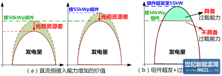 当辐照度较好或温度等环境条件变化时,组件输出功率短时会超过规格书中标定的最大功率,即“组件超发”,这就要求组串式逆变器需具备将组件能量全部转化的能力,即“吐”的能力要强,否则将会出现弃光的现象,降低发电量,影响用户收益,如图11(b)所示。