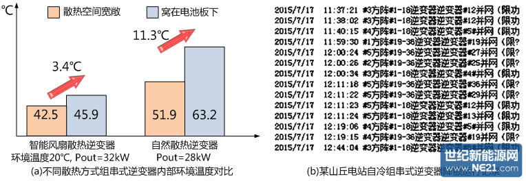 组串式逆变器常处在一个相对封闭的狭小空间内,空气流通不畅,导致逆变器内部环境及器件温度也相应升高。现场调研发现,采用自然冷却的组串式逆变器,在周围散热空间不同时内部环境温度相差高达11.3℃,而对于智能风扇散热的机器仅差3.4℃,如图13(a)所示。组串式逆变器散热能力差,会导致逆变器降额运行,尤其是在山丘电站中“窝在”电池板下方的逆变器。国内某山丘电站现场的组串式逆变器,由于自身散热能力差,在中午发电量最佳的时刻出现了降额运行现象,造成发电量损失超过1%,直接影响了电站投资收益,如图13(b)所示。因此,要重点关注机器的散热能力,选用散热能力好,高温适应性好的强制风冷逆变器。
