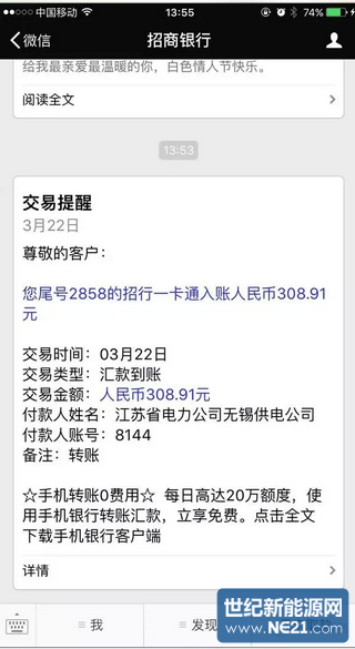 如上文国家发改委通知中规定的,家用光伏电站业主的补贴款是由国家的可再生能源发展基金支付,由电网企业转付,所以补贴收益是电网打给业主,具体方式各地略有区别,但一般情况下应该是在跟电网签合同的时候,会在合同上注明业主的银行卡号,定期由电网打到业主的这张银行卡里。如下图所示。