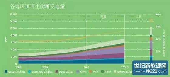 2015年,全球发电量增长23%,其中可再生能源发电量增长约5%。中国仍旧为可再生能源最大市场,2015年中国可再生能源发电量占全球可再生能源发电量的23%,欧盟占17%,美国占11%。