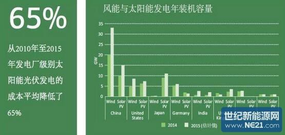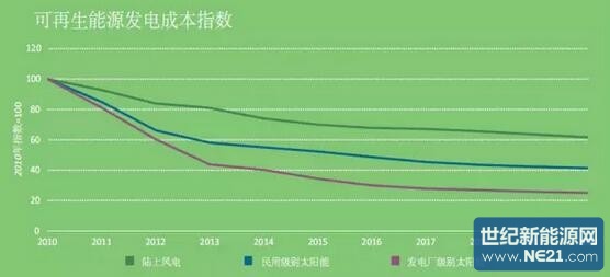 近年来,可再生能源发电成本,特别是风能与太阳能光伏发电呈大幅下滑趋势。2010至2015年,全球新建风能发电场成本平均下降30%,而新建太阳能光伏发电厂成本则下降了65%。预计2015至2020年,陆上风电场成本还将再下降12%,太阳能光伏发电厂成本则会再下降25%。而对于海上风电场建造成本来说,近几年一直呈上涨趋势,这是因为大多数海上风电场的建设场地远离海岸线,导致造价上升。但近期,在丹麦和英国的投标建设合同中显示,2018至2020年海上风电场的建设成本预计会比现在下降20%左右。