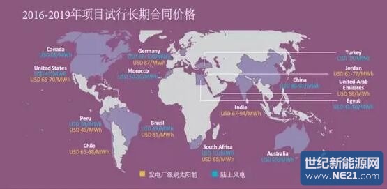 由于科学技术的提升、可再生能源市场的扩大、融资条件的优化,以及长期购电合同为基础的价格竞争模式的普及,可再生能源的效益近年来持续提升。据近期公布的长期购电利润回报合同显示,可再生能源发电成本在未来几年内仍有下降的可能。目前,大多数国家新建陆上风电场合同电价为60~80美金/MWh,最低的为50美金/MWh(如:巴西、秘鲁、埃及等)。太阳能光伏发电场合同电价为80~100美金/MWh(如:法国、德国和乌拉圭),最低的可达60美金/MWh(如:智利、秘鲁、南非等)。