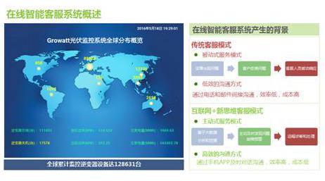 古瑞瓦特市场总监在会上开场表示,“在线智能客服系统”呈现给客户的是一个界面友好、操作简便的APP,但又不仅仅是一个APP,它是能给客户带来无限价值的一套智能系统,是在光伏逆变器行业有独特领导地位的古瑞瓦特发展至今的必然产物。紧接着,张利霞女士向在场观众介绍到,截止2016年6月份,古瑞瓦特已经在全球80多个国家销售超过50万套光伏逆变器,其中约有80%以分布式光伏系统应用为主,包括1-5KW家用逆变器,家用储能系统,以及7-50KW商用逆变器。面对如此庞大分散的安装数量,一方面体现了古瑞瓦特在全球分布式光伏逆变器行业的领先地位,同时也带来了新的挑战,即如何高效快速地提供优质的售后服务,以及如何通过逆变器的智能监控来提高光伏系统的稳定性,以便保持古瑞瓦特在全球市场的持续竞争力。于是,“在线智能客服系统”诞生了。