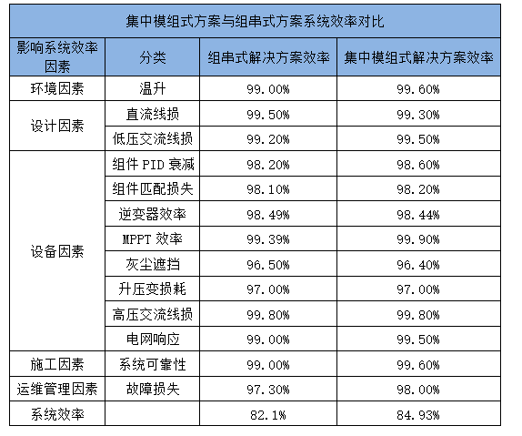 集中模组式逆变器3000m海拔,55℃环温不降额运行;中国效率98.44%(晶硅)、98.525(薄膜),行业领先;集成PID防护及修复功能,有效预防组件PID衰减,避免组件发生PID现象;由于组串式逆变器数量太多,接线较为复杂,可靠性降低,同时,不易管理,特别对于山地,故障后整机更换效率低。根据主要因素评估系统效率对比如表3-3所示。