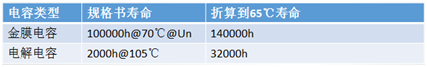 对于组串式逆变器而言,部分组串式逆变器厂家使用不满足长期设计寿命的电解电容,如图3-4所示,根据电容的寿命计算,电解电容的寿命在金膜电容的1/4以下,计算寿命不足8年,电解电容任意工况下理论最大寿命值不足15年。因此,在电站生命周期内需要更换整机3次!极大增加了客户维护投入成本。100MW更换一次需要费用超过4000万元。