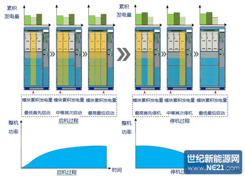 另外,集中模组式逆变器采用专利的智能启停设计,根据其光照强度确定运行模组数量,累积发电量确定模组运行优先级,来平衡模组运行时间,使单模组平均运行时间减少20%,整机寿命提升20%。具体工作过程如图3-7所示。