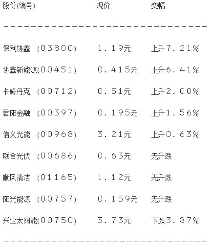 其他光伏股普遍向好,当中协鑫新能源亦抽高逾6%报0.415元。该股将于下周一(23曰)公布业绩。