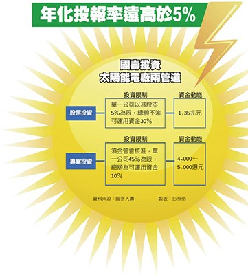 看好绿能产业前景,国泰人寿将与新日光合资,成立一家新的太阳能发电专案公司,将以新建太阳能电厂、收购或整顿经营不善电厂为主,国寿首阶段预计投资15.75亿元,占股45%,新日光及经营团队占55%,预估年化投资报酬率远高于5%。