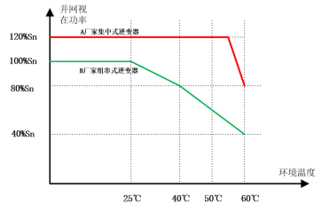 而组串式逆变器过载能力很弱,而且属于全封闭户外电源,阳光越强,对散热的要求越高,实测内部温度与环境温度相差20℃以上,在尘土或杂物覆盖时温差更大,很容易达到降额运行,因降额给客户造成巨大的发电量损失。