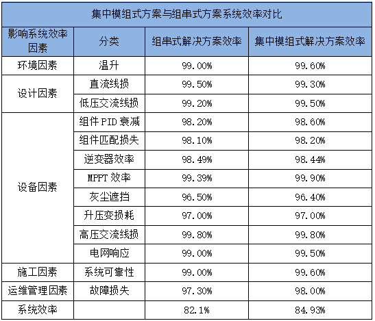 集中模组式逆变器3000m海拔,55℃环温不降额运行;中国效率98.44%(晶硅)、98.525(薄膜),行业领先;集成PID防护及修复功能,有效预防组件PID衰减,避免组件发生PID现象;由于组串式逆变器数量太多,接线较为复杂,可靠性降低,同时,不易管理,特别对于山地,故障后整机更换效率低。根据主要因素评估系统效率对比如表3-3所示。