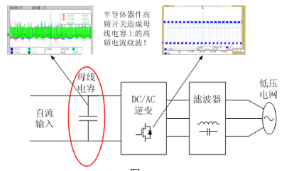 光伏电站的投资回报周期较长,为获得预期收益必须保证电站稳定运行20年以上。如此一来,器件选型对逆变器的寿命起着决定作用,同时,电容是逆变器内部实现能量交换的重要器件之一,其使用寿命直接关系到逆变器的整机寿命,而逆变采用高频斩波技术,母线电容将承担很大的高频纹波电流。如图3-3所示。