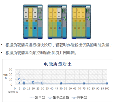 集中模组式逆变器集中并网,避免系统出现谐波震荡及弱电网现象,同时,根据负载情况进行模组投切、变频控制,使全功率范围内均能输出优质的电能质量。