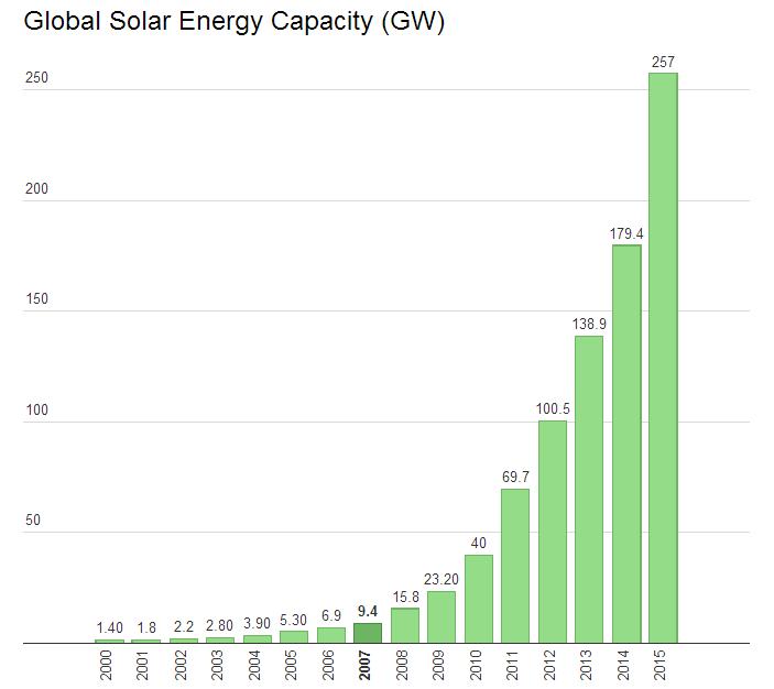 整体而言,2009-2015年,世界太阳能装机容量增长了10倍之多,2002-2015年,世界太阳能装机容量更是增长了100倍以上。预计到2025年,全球太阳能装机容量将超过756吉瓦。