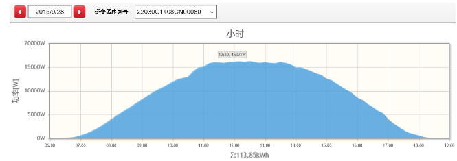 那从单日的功率曲线中我们又可以获得哪些信息呢?小编截取了2015年9月25日的曲线图,曲线反应当日是晴空万里,万里无云,蔚蓝的天空上飘着朵朵白云(额。。。小编一不小心就暴露了语文是体育老师教的往事),光照强度比较高,而曲线显示当日最大功率为16321W。