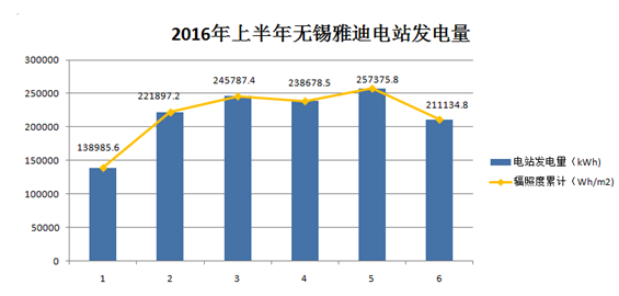 根据图中数据可以看出,雅迪发电站的月平均发电量为21.89万度电,由于1月正值冬季,而6月则是梅雨季,所以相比于其他几个月份发电量有明显减少。