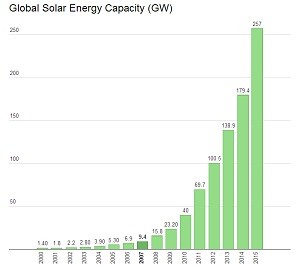 整体而言,2009-2015年,世界太阳能装机容量增长了10倍之多,2002-2015年,世界太阳能装机容量更是增长了100倍以上。预计到2025年,全球太阳能装机容量将超过756吉瓦。