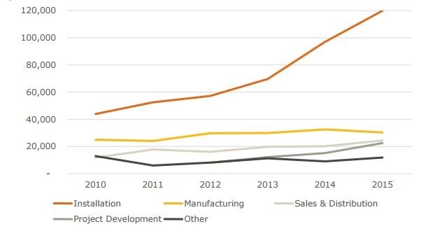 根据美国劳工部数据,美国太阳能行业在2015年所创造的就业岗位超过美国油气勘探和管道工业的总和,其增速更是美国经济增速的12倍。