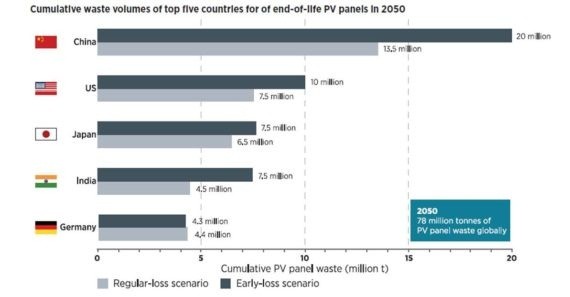 根据国际可再生能源机构IRENA和国际能源署IEA联合发布的报告显示,截止2016年底,全球累计光伏废弃产品将达到4.35-25万吨,相当于累计安装量的0.1-0.6%。但是到2050年,全球累计废弃光伏材料将达到7800万吨,其中,中国占1350-2000万吨,美国占750-1000万吨。