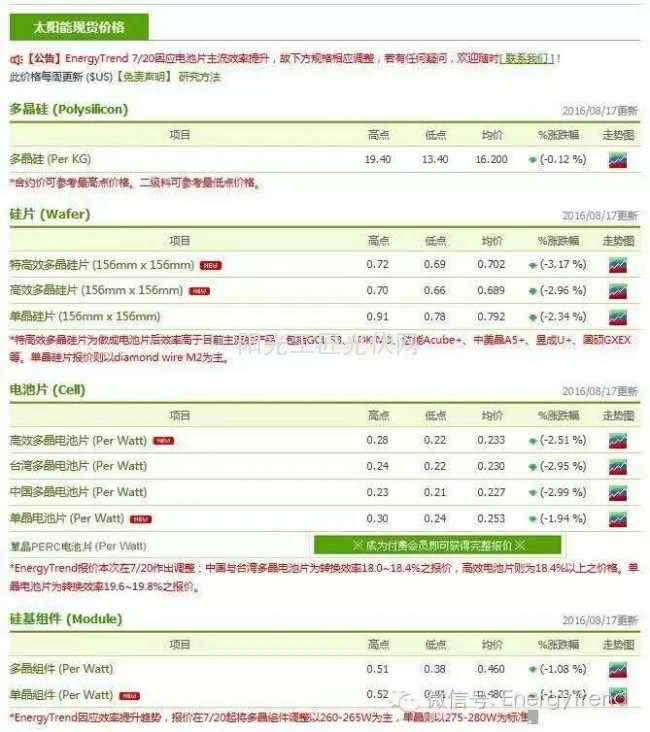 由于多晶硅片一、二线厂八月仅微幅降低稼动率,使得多晶硅在中国仍处于供需平衡的状态,虽六月起多晶硅价格每月缓跌,然目前中国现货价格跌幅尚不明显,近期在RMB 138-141/kg (约为US$ 17.7~18.1/kg) 区间弱势盘整。第三季起部分多晶硅厂商利用检修、小幅减产等方法调整供应量,以控制降价速度。但下游快速跌价仍给予多晶硅厂家极大压力,在硅片厂下修稼动率后,预期后续多晶硅也将开始出现明显跌价。