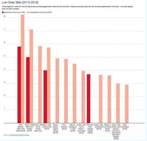 如下图所示,2013年以来光伏最低报价从First Solar在美国新墨西哥州报出5.79美分/千瓦时(补贴后)的最低价以来,光伏报价最低纪录不断被打破,而且开发商不再依赖电价补贴。在此次Sun Edison创下新纪录之前,上一个纪录是Masdar Consortium2016年5月在迪拜报出的2.99美分/千瓦时。