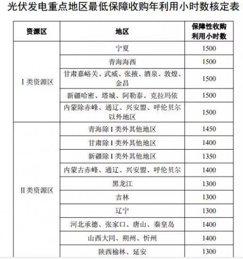 我们来看此前5月底,国家发改委、能源局发布的《关于做好风电、光伏发电全额保障性收购管理工作的通知》。文件中详细规定了风力、光伏发电重点地区的最低保障收购小时数。光伏发电、风电的重点地区根据目前存在问题的严重性被分为一类和二类,各地的保障性收购小时标准不同,其中光伏发电最高门槛为1500小时,最低1300小时;风电最高为2000小时,最低1800小时。