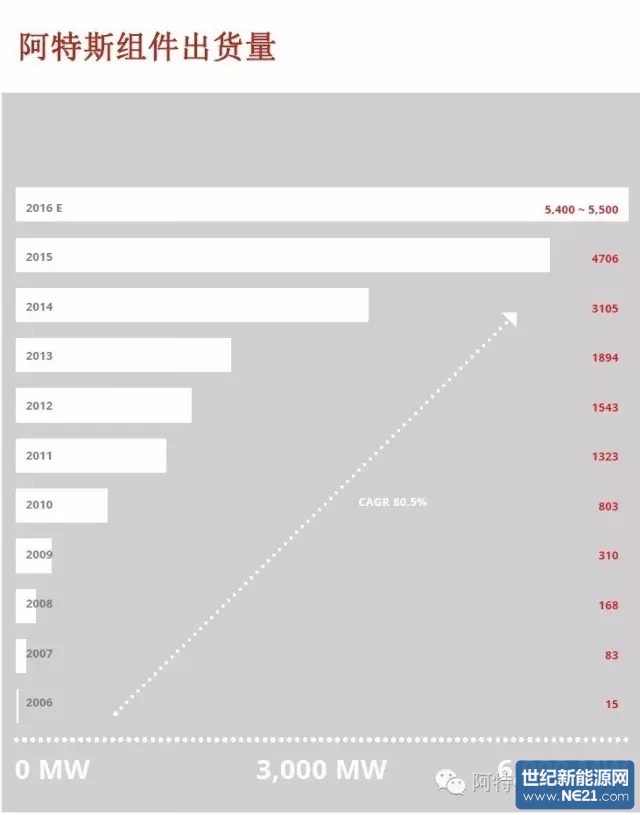 阿特斯的发展史,也正是整个行业发展的缩影和见证。早在2002年,我们开发了公司的第一款产品—奥迪三瓦太阳能汽车充电器,当时一共生产了二十万台,总容量约700千瓦。随着公司不断的成长发展,我们目前主要生产的是320瓦太阳能组件产品,每一年的组件出货量约在5.4—5.5吉瓦左右。短短十五年的时间,增长愈8000倍。