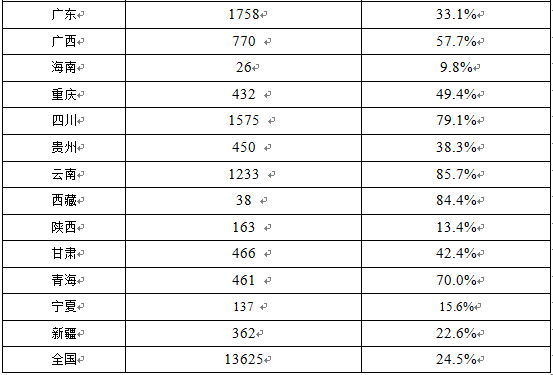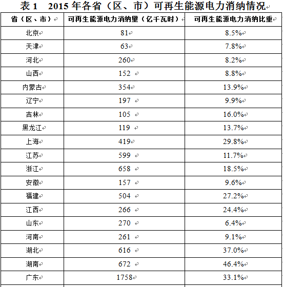 2015年,包含水电在内,全部可再生能源电力消纳量为13625亿千瓦时,占全社会用电量中的比重为24.5%。综合考虑各省本地生产、就地利用以及外送电力消纳量情况,2015年各省(区、市)可再生能源电力消纳量占本地区全社会用电量的比重如下: