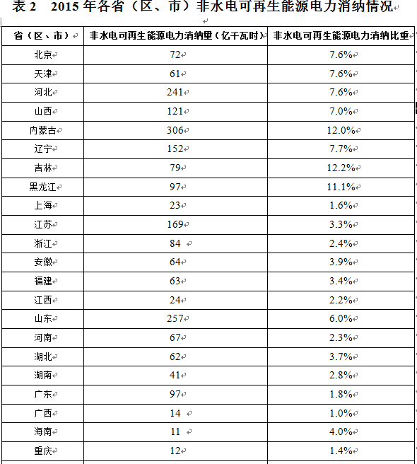 2015年,全国非水电可再生能源电力消纳量为2778亿千瓦时,占全社会用电量中的比重约为5.0%。综合考虑各省本地生产、就地利用以及外送电力消纳可再生能源电量情况,2015年,各省(区、市)非水电可再生能源电力消纳量占本地区全社会用电量中的比重如下:
