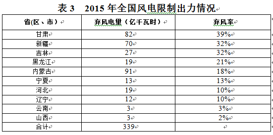 2015年弃风限电形势严峻,全国弃风电量339亿千瓦时,同比增加213亿千瓦时,其中,甘肃弃风电量82亿千瓦时、弃风率39%,新疆弃风电量70亿千瓦时、弃风率32%,吉林弃风电量27亿千瓦时、弃风率32%,内蒙古弃风电量91亿千瓦时、弃风率18%。