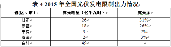 2015年,西北地区出现了弃光现象,其中甘肃弃光电量26亿千瓦时、弃光率31%,新疆弃光电量18亿千瓦时、弃光率26%。