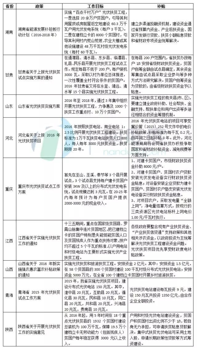 紧跟国家政策,各省也纷纷出台了光伏扶贫相关政策,都根据本省的特殊情况制定了光伏扶贫的具体目标、补贴方式和扶贫模式。