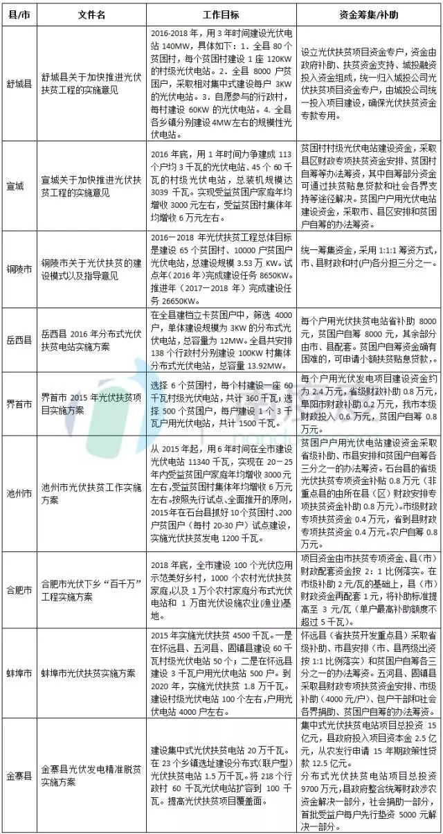不同于省级的政策制定的是一个宏观的目标计划,县级的相关政策则更具有落地性和实操性。其中,安徽省在光伏扶贫中表现得最为积极。