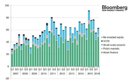 2016年第二季度的清洁能源相关投资为615亿美元,比第一季度增长了约12%,但与极为坚挺的上年同期相比则减少了32%。