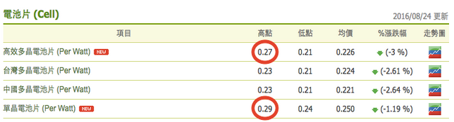 电池片是目前跌幅最深的区段,成交的单价多让电池片厂大幅亏损,在多做多亏情势下,台湾电池片厂稼动率持续下探,平均稼动率低于五成。另外,中国电池厂商仍陆续做出下修稼动率的反应,整体而言下月情况更加低迷,价格无法在九月落底。因中国“领跑者计划”需采用高效电池,单、多晶perc产品近期询问度高,虽台湾perc量产的量、与效率首屈一指,但一般电池的跌幅也带动perc价格跌价明显,目前主流单晶perc价格已到US$0.28-0.3/W之间。