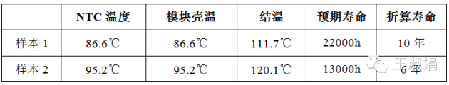 根据表1中样本1和样本2模块的内部温度,推算出模块结温和两者模块寿命对比如表3(推算过程专业性强,这里不在赘述)。