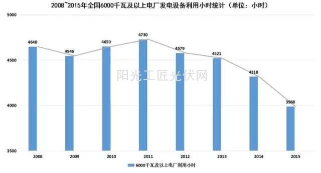 数据显示,2015年中国全社会用电量55500亿千瓦时,同比仅增长0.5%。同期,全国发电量56184亿千瓦时,同比下降0.2%。发电机组平均利用小时数降低。2015年全国6000千瓦及以上电厂发电设备累计平均利用小时为3969小时,同比减少349小时。其中,水电设备平均利用小时为3621小时,同比减少48小时;火电设备平均利用小时为4329小时,同比减少410小时。