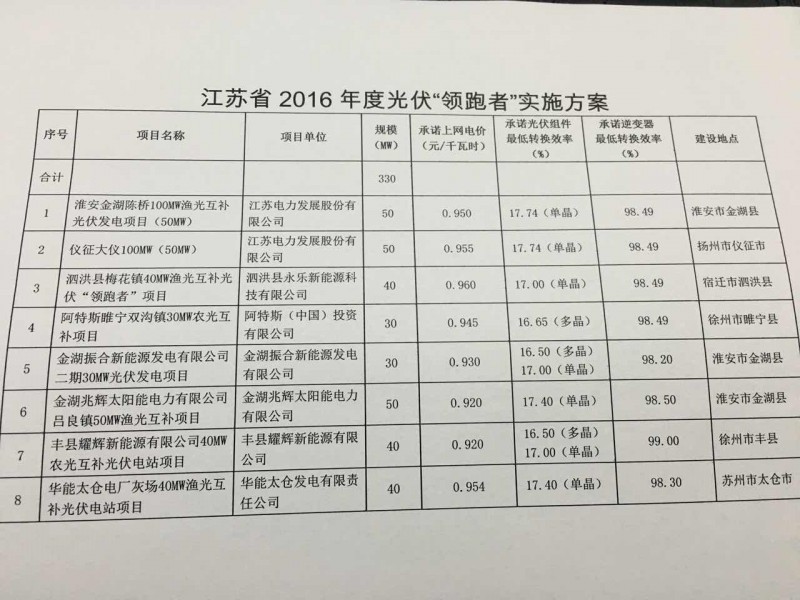 江苏发布2016年度光伏“领跑者”实施方案。方案显示,江苏2016年光伏“领跑者”项目总装机规模330MW。