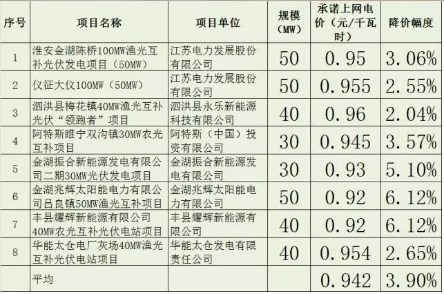 江苏省八个领跑者项目承诺电价的降价幅度从2%~6%不等,平均降幅为3.9%。