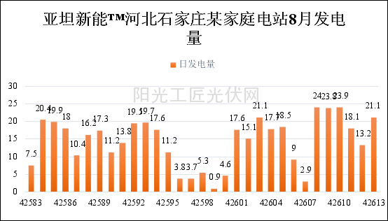 根据上图数据及7月份电站发电量数据来看,电站在7月和8月的发电总量几乎持平,虽然8月份的高温季已经几乎结束,但电站发电量丝毫未受影响,除了有几天极端天气,导致电站几乎没有发电量,其余时间几乎都保持了稳定的发电趋势。