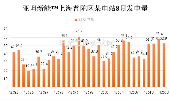 上海地区的电站在8月份的整体发电量方面,总体来说比较理想,几乎没有雨天,保证了电站每天都有发电量,同时对比7月上升了35度,因此高温季对于电站发电量来说并不是非常理想的天气情况,预计在9月份,电站的整体发电量将会持续走高。
