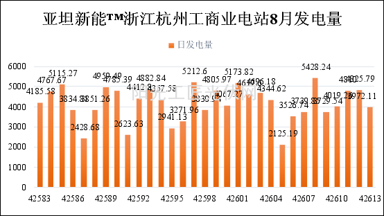 根据上图数据可以看出,8月份的电站发电量整体趋势比较平稳,同时8月对比7月发电量上升了17221度,由此也可以看出,江浙沪的天气直接影响了电站的总体发电量,特别是入秋之后,雨季和乌云天气大大减少,都给电站带来了比较好的发电条件。