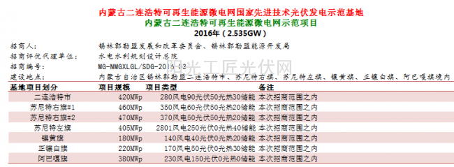 紧跟其后,二连浩特组织了关于风光储多能互补示范工程建设的实施意见的上报工作,于2016年8月8日可再生能源微电网项目获得国家能源局批复后,二连浩特可再生能源微电网的七个集群项目总装机容量达2535MW,详细分配情况如下表所示:
