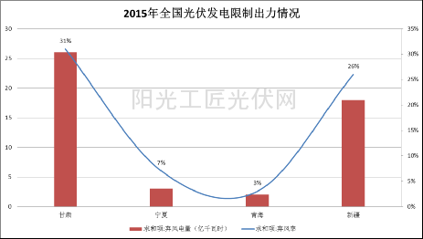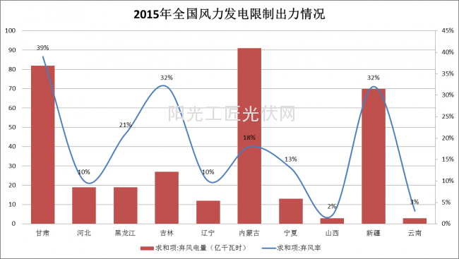 2015年弃风限电形势严峻,全国弃风电量339亿千瓦时,同比增加213亿千瓦时,其中,甘肃弃风电量82亿千瓦时、弃风率39%,新疆弃风电量70亿千瓦时、弃风率32%,吉林弃风电量27亿千瓦时、弃风率32%,内蒙古弃风电量91亿千瓦时、弃风率18%。