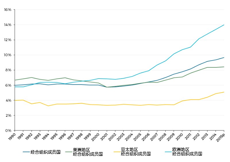 表5:1990~2015年经合组织成员国各地区在可再生能源电力生产中的占比