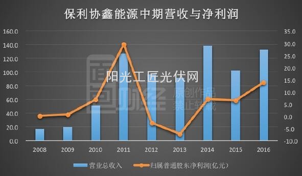 保利协鑫能源是目前全球最大的太阳能光伏企业之一;据财报2016年上半年保利协鑫的总营收为131.58亿元,同比增长28.73%。净利润则由去年中期的6.52亿元,上涨到今年的13.93亿元,同比增长113.7%。下图是根据财报数据整理的该公司历年营收与利润走势图。