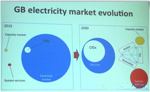 能源的发展对未来的市场架构是一个非常重要的要素。我国新一轮的电市化改革刚刚启动,新能源市场刚刚建立,大家的关注点主要集中在售电市场怎么匹配,新的售电领域怎么划分,并没有过多的考虑可再生能源在未来的市场架构中相应机制的设计,实际上这是我们需要高度重视的一个方面。以英国为例,以下是英国电力市场的分析: