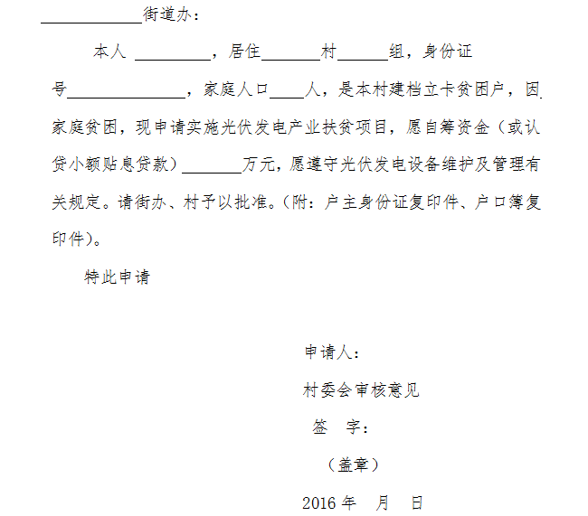 1、宣传摸底。街道办事处、村、脱贫小分队广泛宣传光伏产业扶贫政策、特点、效益状况,并入户调研,发放《3千瓦分布式光伏发电项目安装申请表》(附件1)。