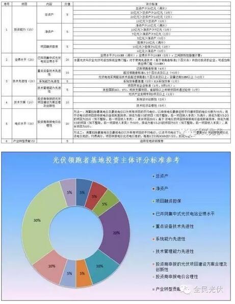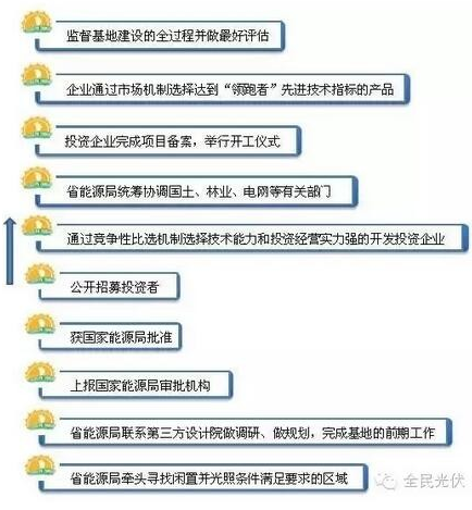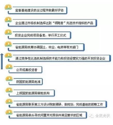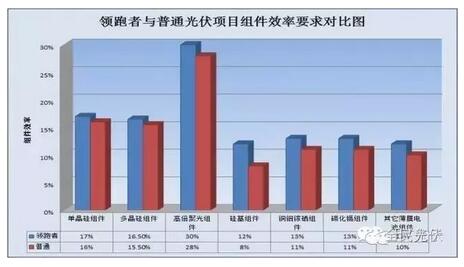 国家能源局、工业和信息化部、 国家认监委公布《关于促进先进光伏技术产品应用和产业升级的意见》(国能新能【2015】194号),意见中指出国家能源局每年安排专门的市场规模实施“领跑者”计划,要求项目采用先进技术产品。“领跑者”计划通过建设先进技术光伏发电示范基地、新技术应用示范工程等方式实施。国家能源局提出示范工程的主要技术进步指标、建设规范、运行管理及信息监测等要求。省级能源主管部门通过竞争性比选机制选择技术能力和投资经营实力强的开发投资企业,企业通过市场机制选择达到“领跑者”先进技术指标的产品。
