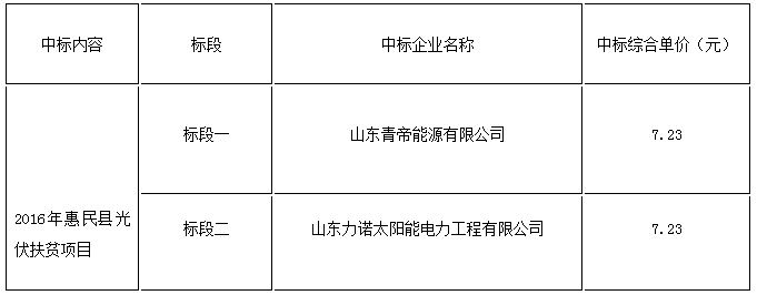 原标题:2016年山东惠民县光伏扶贫项目中标(成交)公告