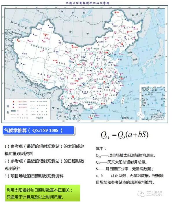 我国有辐射观测的气象站比较少,只有98个。项目场址附近的气象站,往往没有辐射观测数据。在这种情况下,一般采用“气候学方法推算”的方法。一般,日照时数或日照百分率是每个气象站都有的监测数据。因此,就可以利用两地的日照百分率、天文总辐射量进行推算。如果不具备推算条件(距离远、海拔等条件相差大),则只能选用其他来源数据。